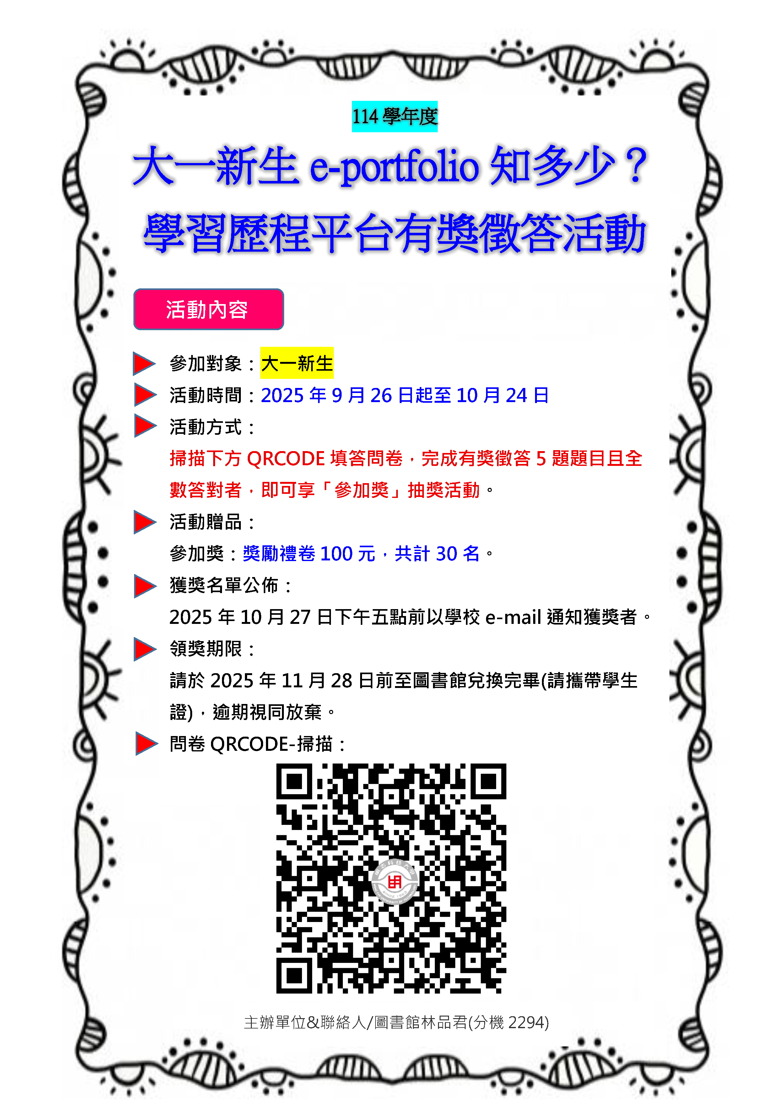 114學年度「大一新生e-portfolio知多少?學習歷程平台有獎徵答活動」