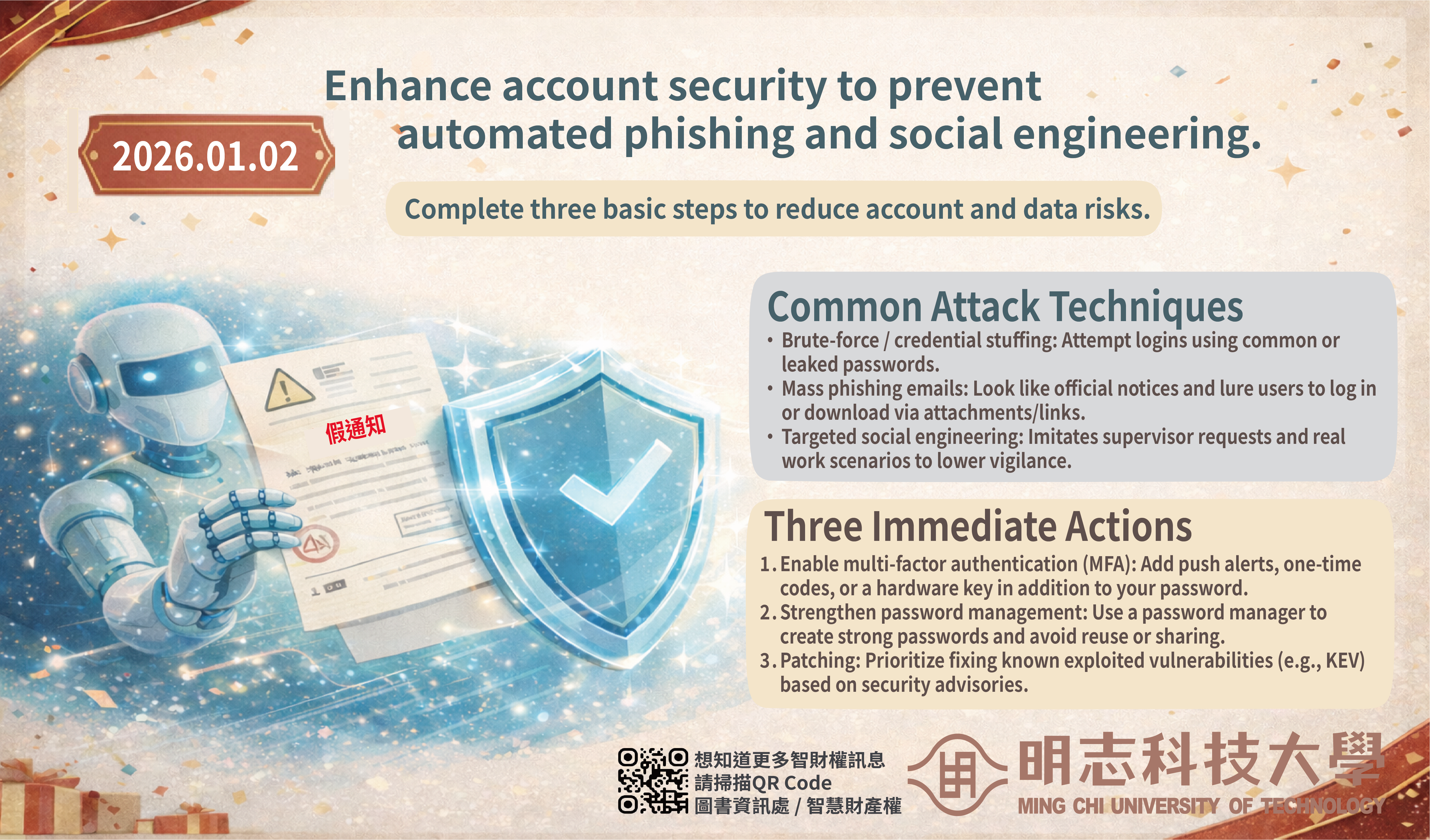 As artificial intelligence and automation technologies continue to develop rapidly, cyberattack techniques are becoming increasingly sophisticated. Incidents involving automated phishing emails, brute-force attacks, and targeted social engineering aimed at user accounts are also on the rise, posing tangible risks to campus information security and personal data protection. To reduce the likelihood of account compromise and personal data leakage, please complete the following three basic protective measures to mitigate these risks.