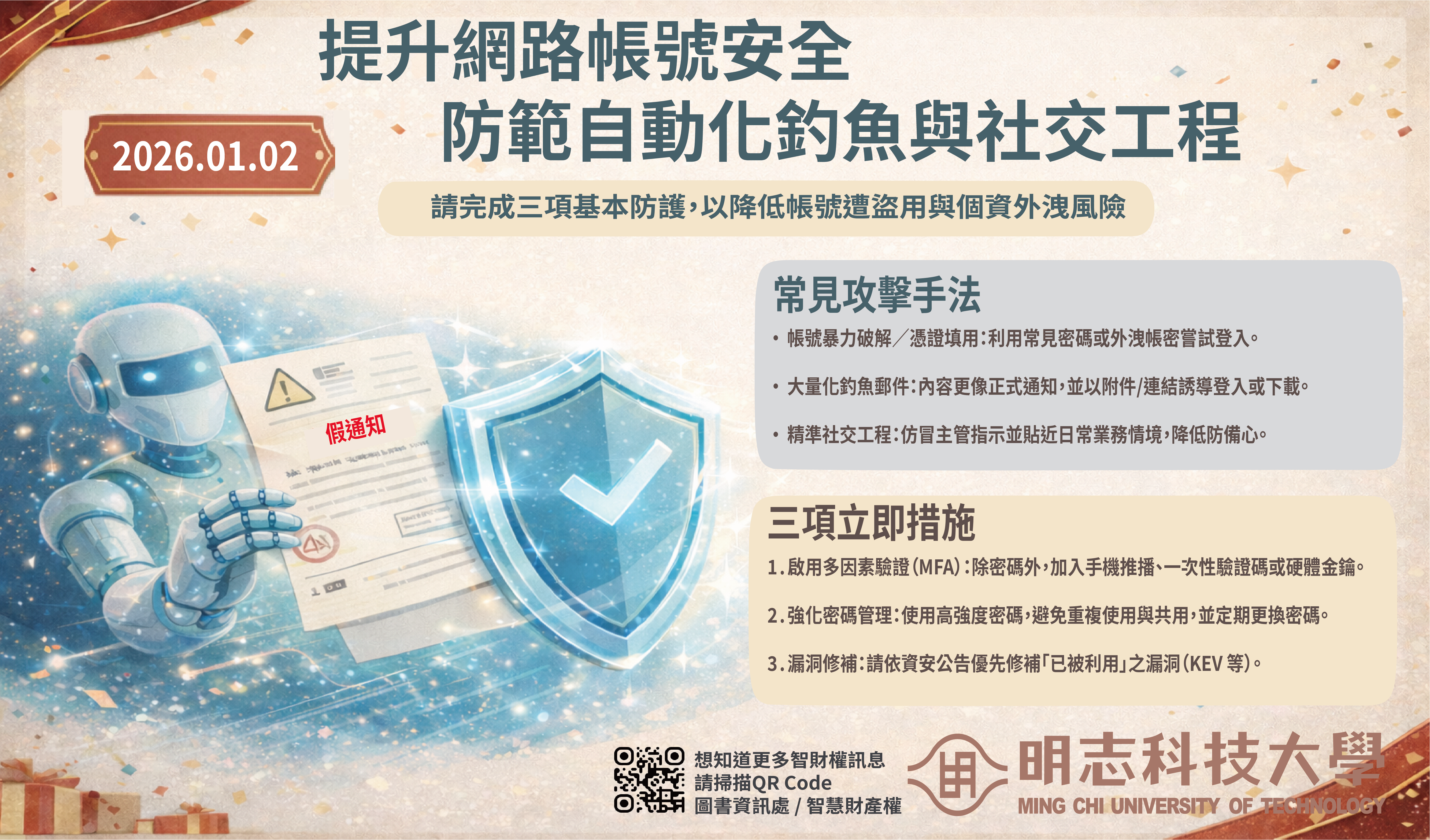 隨著人工智慧與自動化技術快速發展,網路攻擊手法日益精緻,針對帳號的自動化釣魚郵件、暴力破解及精準社交工程事件亦持續增加,對校園資訊安全與個人資料保護構成實質風險。為降低帳號遭盜用及個資外洩之可能,請完成三項基本防護,以降低帳號遭盜用與個資外洩風險。