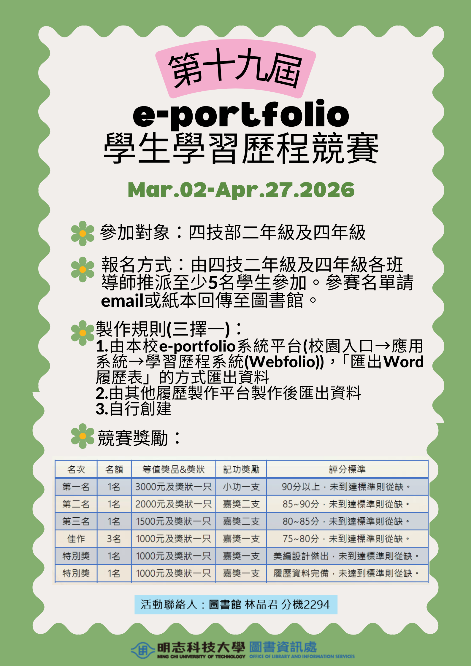 (1) Submission Deadline: Submit the competition portfolio in PDF format via email to Ms. Lin Pin- Chun at the library before 5:00 PM on April 14 (Tuesday).